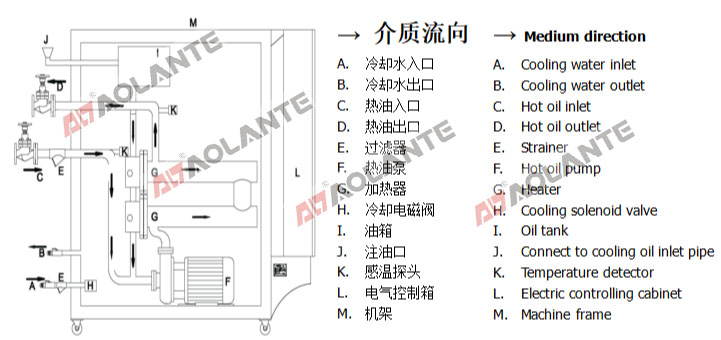 傳熱媒體(油)通過I(油箱)進(jìn)入系統(tǒng),由F(循環(huán)油泵)打到模具后再回到系統(tǒng),周而復(fù)始。媒體(油)在經(jīng)過G(加熱器)升溫,由K(感溫探頭)探測(cè)媒體(油)溫度,當(dāng)溫度達(dá)到要求時(shí),G(加熱器)停止工作。當(dāng)溫度需要下降時(shí),H(電磁閥)打開,冷卻水由A經(jīng)過B到H(電磁閥)進(jìn)入熱交換器,熱交換器里的熱水經(jīng)過B排到冷卻水塔,從而間接使熱循環(huán)油系統(tǒng)內(nèi)溫度下降。