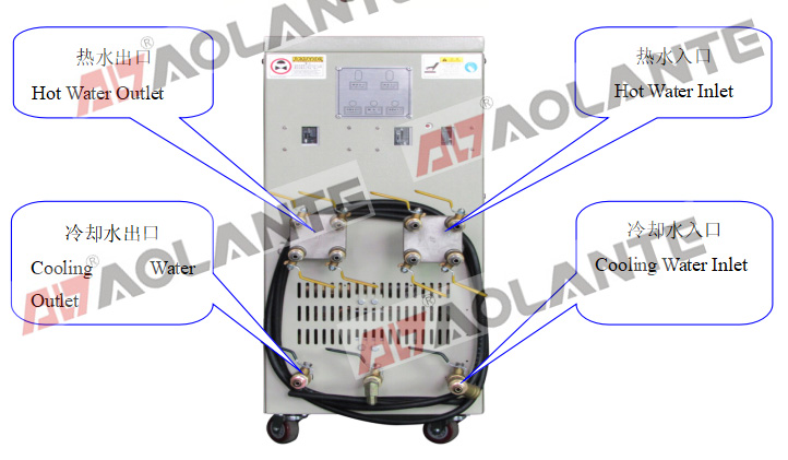 水循環(huán)溫度控制機特別注意事項:管路接頭于120℃以下可使用快速接頭,高于120℃一定要使用油壓接頭,因管路壓力大,請勿使用插芯及管束。